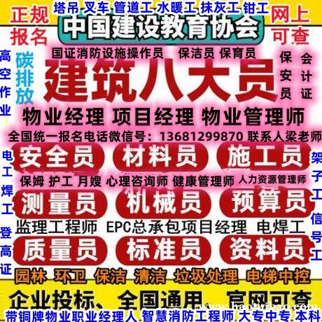 建筑类常报八大员:施工员,安全员报名咨询梁老师,资料员,材料员报名咨询梁老师,监理员,测量员报名咨询梁老师,质量员,预算员报名咨询梁老师,合同员,ji械员报名咨询梁老师,还有监理工程师合格证, 联系我时,请说是在好推宝看到的,谢谢!